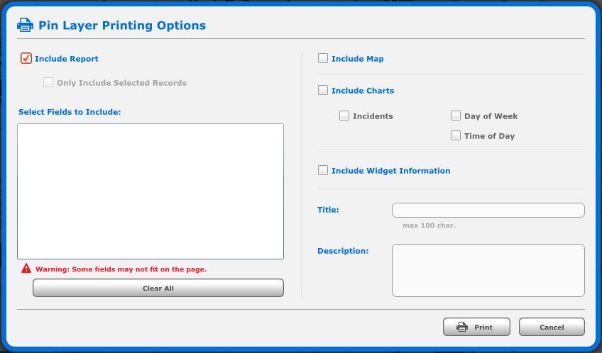 The Include Charts check box will let you print charts. You can choose to print any combination of an Incidents (Pie) Chart, Day of Week chart and a Time of Day chart.