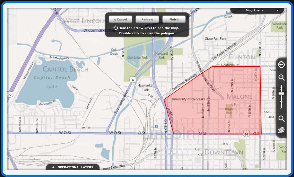 You can then click the Finish button to accept your boundary. Clicking the redraw button will let you draw another boundary. Clicking cancel will bring you back to the Where Tab and your boundary will not be saved.