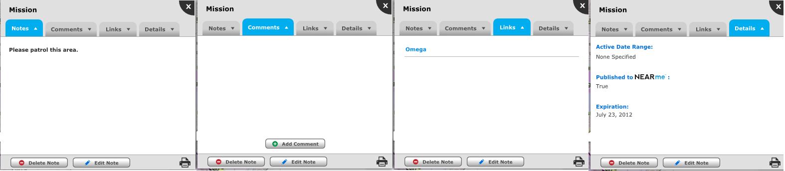 The Comments tab will display any comments that have been added to the Note or Mission. You can also add Comments from this tab. Depending on your Dashboard's configuration and the Note's settings this tab may not be available.
